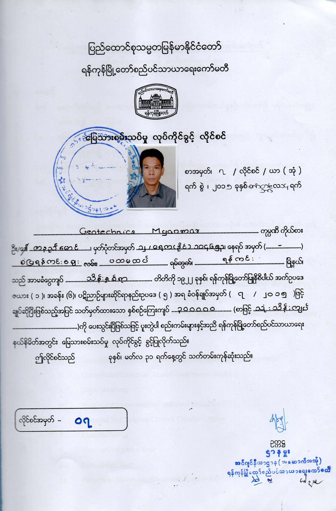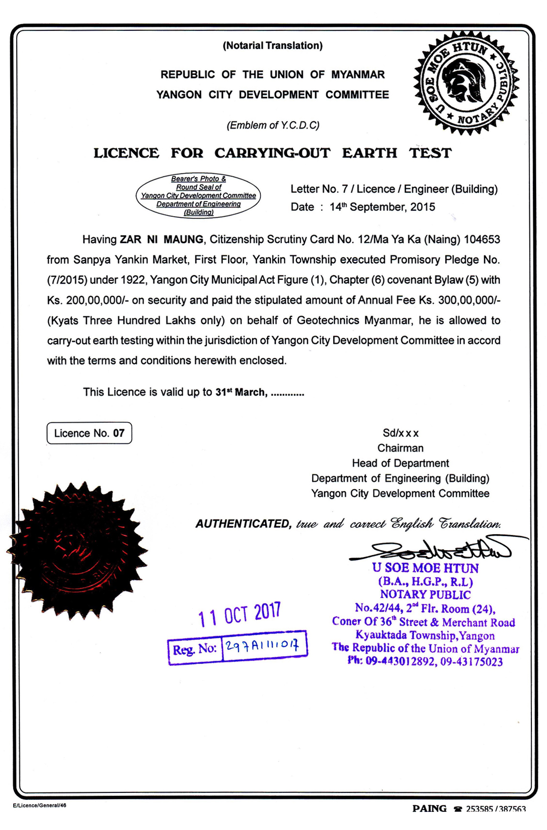 Geotechnics Myanmar Company is accredited with the Geotechnical Investigation License Contractors in Myanmar from Yangon City Development Committee. Yangon City Development Committee (YCDC) is the administrative body of Yangon, the largest city and former capital of Myanmar.