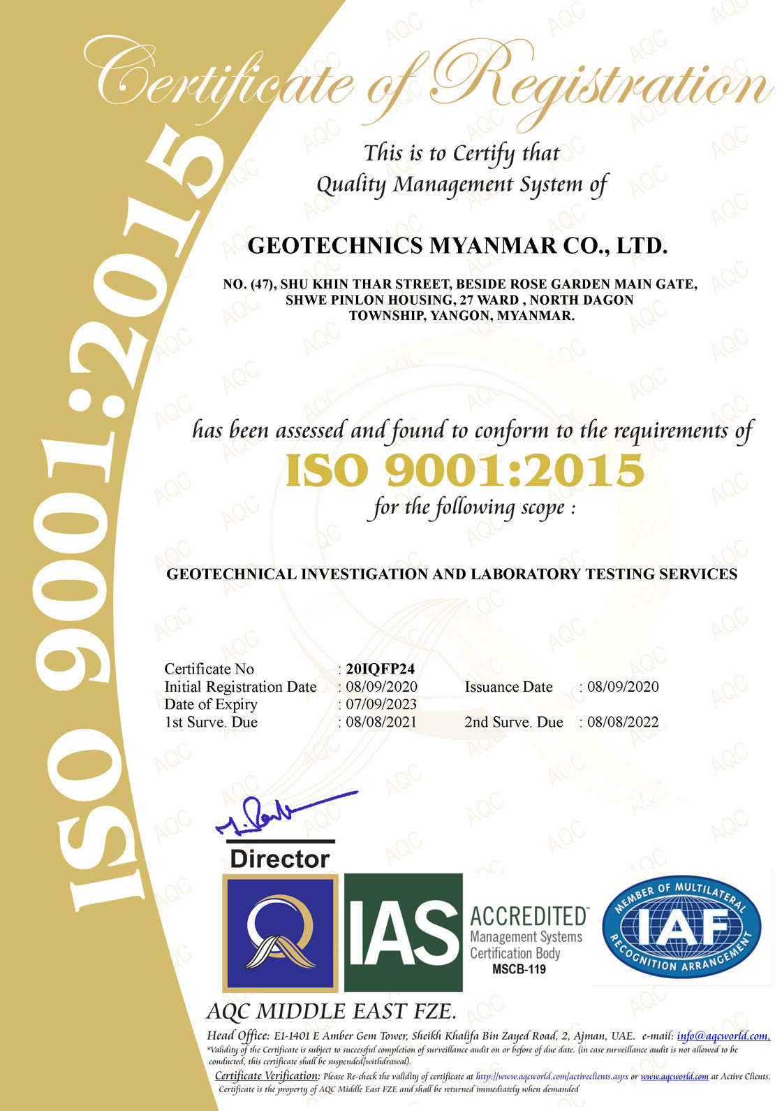 Our Company, Geotechnics Myanmar was certified ISO 9001:2015 Quality Management System which is scope of Provision of Geotechnical Investigation and Laboratory Testing Services, from IAS (International Accreditation Services, United State of America). This new standard, ISO 9001:2015 is based on new High Level Structure (HLS) that brings a common framework to all management system standards which is helps to keep consistency, alignment different management system standards, offer matching sub clauses against the top level structure and apply common language across all standards. The key changes in the standards are: