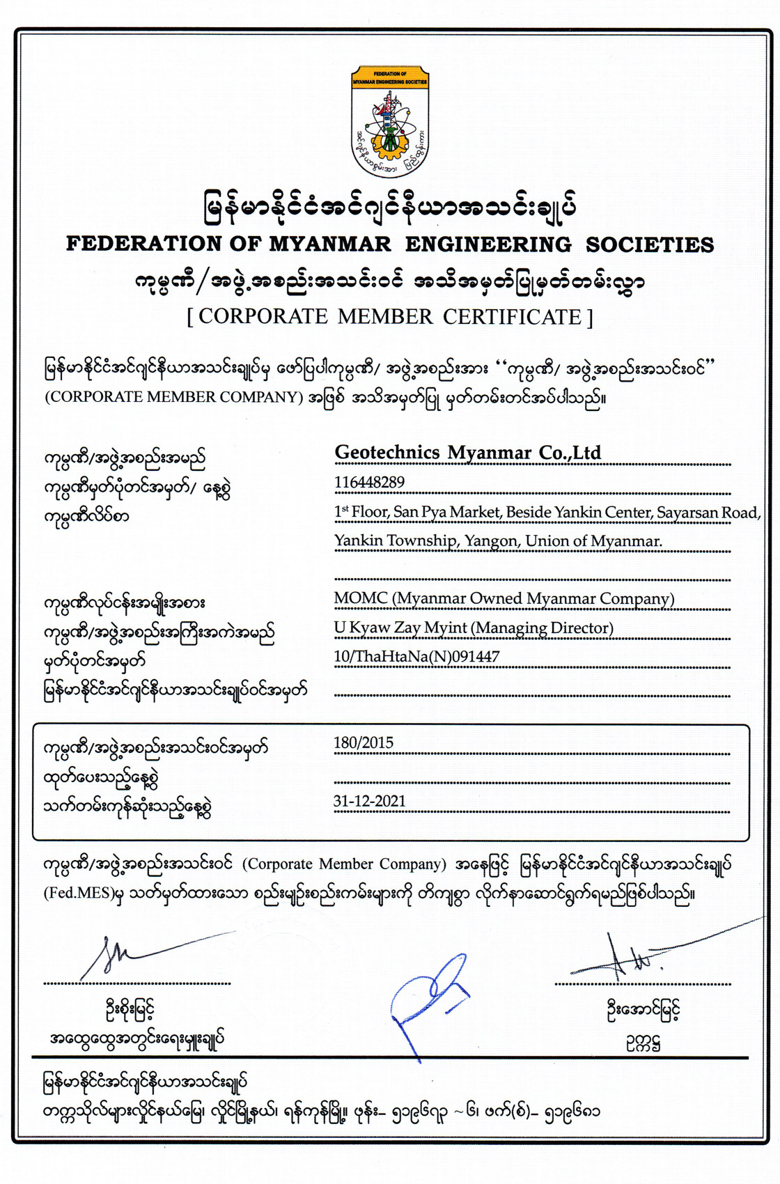 Geotechnics Myanmar Company is a corporate member of Myanmar Engineering Society (MES) since in 2012.